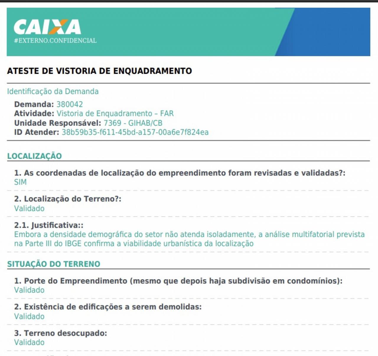 “Vistoria de enquadramento finalizada sem pendências. Ratificada. Qualificação: Enquadrado – Superior”. É este o “sim” dado pela Caixa Econômica Federal à Prefeitura de Sorriso referente ao pedido, feito em junho, de 200 apartamentos do Programa Minha Casa, Minha Vida. Os imóveis devem ter como destino o atendimento de famílias que integram a Faixa 1 do Minha Casa, Minha Vida, cuja renda total é de até R$ 2.850,00.