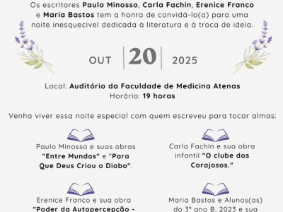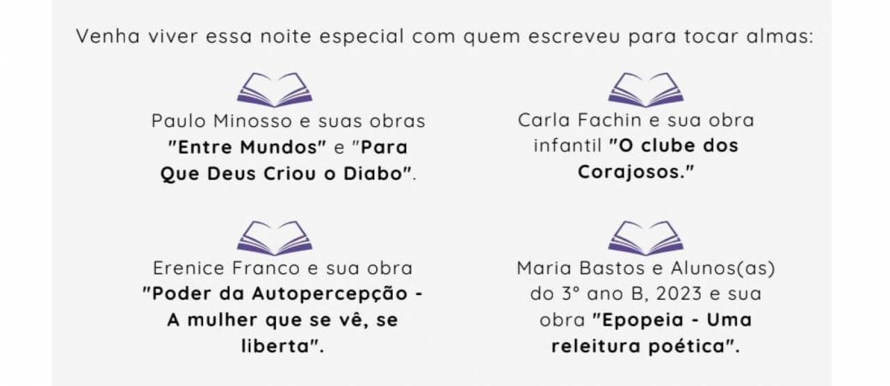 Entre os lançamentos, estão “Entre Mundos” e “Para que Deus Criou o Diabo”, ambos do escritor Paulo Minosso, que navega entre o filosófico e o fantástico; o livro infantil “O Clube dos Corajosos”, de Carla Fachin, que fala sobre amizade e superação; e a obra “O Poder da Sua Autopercepção – A Mulher que se Vê, se Liberta”, de Erenice Franco, que convida o leitor a um mergulho de autoconhecimento e empoderamento feminino.