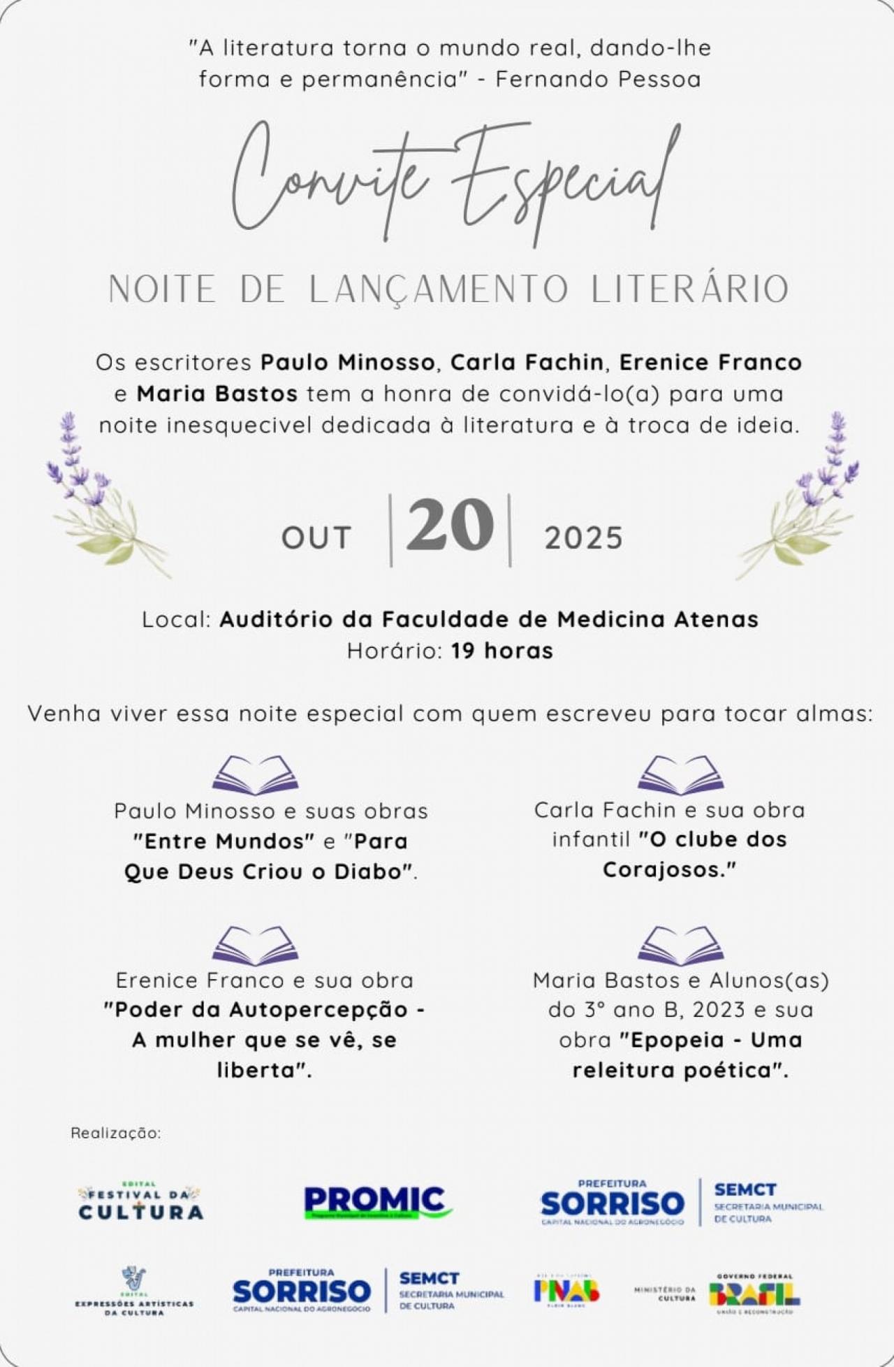 A literatura sorrisense ganha novos capítulos nesta segunda-feira (20), com o lançamento de quatro obras inéditas escritas por autores do município, em um evento que promete emoção, reflexão e valorização da produção local.