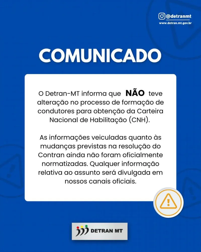 O Departamento Estadual de Trânsito de Mato Grosso (Detran-MT) informou que, até o momento, não houve qualquer alteração no processo de formação de condutores para obtenção da Carteira Nacional de Habilitação (CNH) no estado.